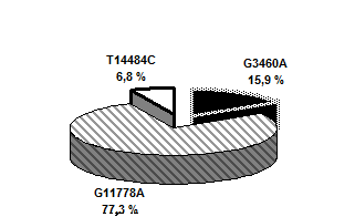 1. Установлено, что наиболее часто в российских семьях с АЗНЛ встречается мутация G11778A (77,3 % семей), второй по частоте является мутация G3460А (15,9 %), наиболее редкой — мутация T14484C (6,8 %), что согласуется со средними мировыми данными. В 97,7% мутации обнаружены в гомоплазмическом состоянии. Гетероплазмия (40 % мутантной мтДНК в клетках крови) выявлена в одной семье (2,3 %), где сочетаются случаи АЗНЛ с гомо - и гетероплазмией.