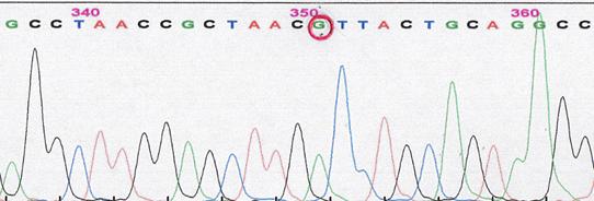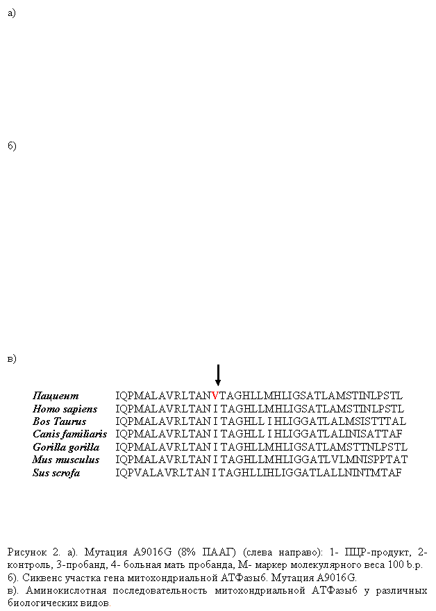 При молекулярно-генетическом исследовании у пробанда и матери обнаружены первичная мутация мтДНК T14484C, вторичные мутации Т4216С, G13708A, G15257A, G15812A, а также новая, ранее не описанная мутация A9016G в гене АТФ-азы 6.