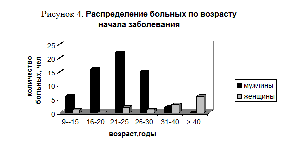 Приведенные в табл. 3 данные показывают, что наблюдается статистически достоверное (на уровне значимости p<0,01) превышение возраста начала заболевания среди женщин по сравнению с мужчинами.