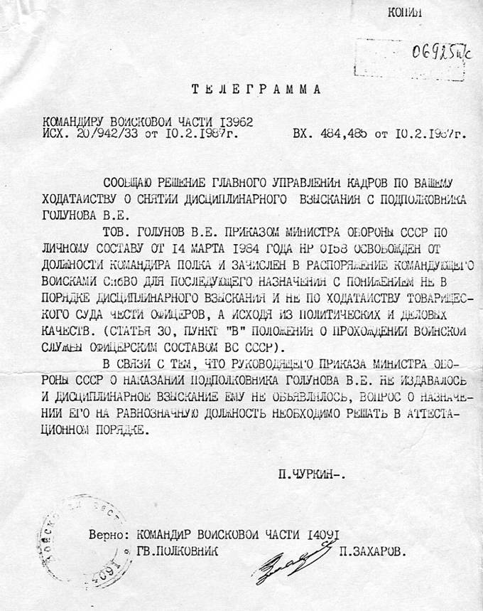 Имея на руках заключение экспертизы, письменные подтверждения генерал-майоров , генерал-майора , генерал-майора и полковника , я обратился в парткомиссию при Политуправлении Сухопутных войск при Главном Политуправлении СА и ВМФ. Ответа не последовало! Тогда обратился в Центральную Контрольную Комиссию КПСС. Ее решением мне была изменена формулировка партийного взыскания. Политотделу дивизии рекомендовали произвести обмен партийных документов.