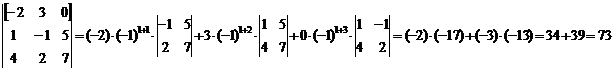 В определителе десять миноров второго порядка, расположенных во второй и пятой строках, но только три из них отличны от нуля. Поэтому, данный определитель удобнее разложить по второй и пятой строкам: