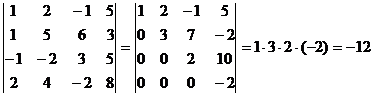 Приведём определитель к треугольному виду, умножив первую строку последовательно на (‑1), 1, (‑2) и сложив соответственно со второй, третьей и четвёртой строками.