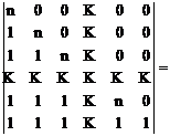 Первый определитель в сумме – треугольного вида относительно главной диагонали, поэтому он равен произведению диагональных элементов, т. е. (n–1)n. Второй определитель в сумме преобразуем, прибавив последнюю строку ко всем предыдущим строкам определителя. Полученный при этом преобразовании определитель будет треугольного вида относительно главной диагонали, поэтому он будет равен произведению диагональных элементов, т. е. nn-1: