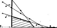 Отметим эти точки на осях рис. 1.1 и проведем через них прямую, соответствующую первому ограничению. На рисунке она маркирована треугольниками. Если взять координаты любой точки, лежащей на этой прямой, то они обратят первое ограничение в равенство. Для выявления точек, координаты которых строго удовлетворяют данному ограничению, нужно указать на одну из образовавшихся полуплоскостей.