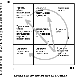 В первом случае (см. Рисунок 1, направление 1) оптимальной считается следующая траектория развития позиций компании: от Удвоения объёма производства или свёртывания бизнеса - к Стратегии усиления конкурентных преимуществ - к Стратегии Лидера вида бизнеса - к Стратегии роста - к Стратегии генератора денежной наличности - к Стратегии частичного свертывания - к Стратегии свертывания (выхода из бизнеса).