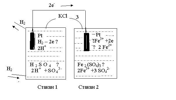 Комбинируя со стандартным электродом (стакан 1) другую пару, например Fe3+/Fe2+, находящуюся в стакане 2, в который опущен индикаторный электрод – гладкая платиновая пластина, можно получить гальванический элемент.