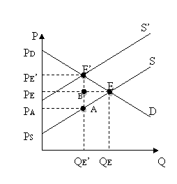 -Каковы новые равновесные значения цены и количества PE’ - ?; QE’ - ?