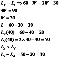 Функция спроса и предложения на рынке труда: Ld=70-W, Ls=4W-30.Правительство установило минимальную заработную плату на уровне 30 ден. ед. Определить влияние этой меры на состояние рынка труда.