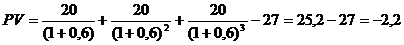 В начале действия проекта осуществлено его инвестирование в размере 27 млрд. долларов. В течение 3-х лет (в конце года) выручка поступает одинаковыми суммами в размере 20 млрд. долларов. В ближайшие три года реальная ставка процента r =60%. Выгоден ли данный проект?