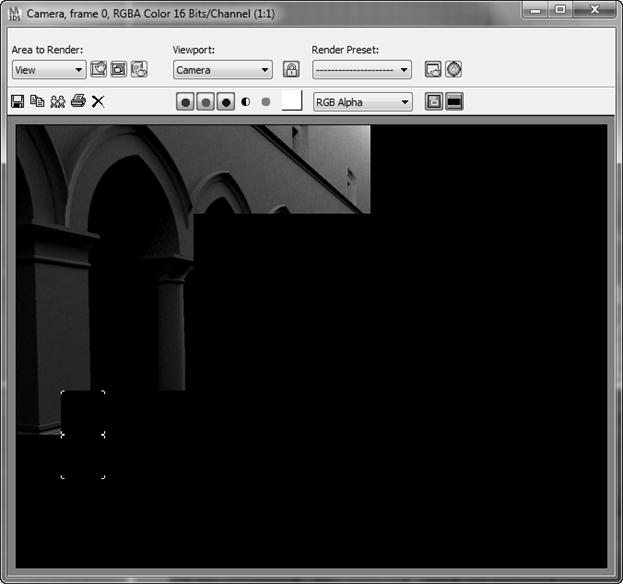 При использовании mental ray Вы сразу обратите внимание на несколько заметных отличий в окне визуализируемого кадра ‑ Rendered Frame Window (RFW). В отличие от стандартного визуализатора, который выводит в это окно результат работы строками пикселов сверху вниз, mental ray визуализирует кадр сегментами (buckets) – небольшими прямоугольными блоками пикселов. Как только очередной сегмент кадра обработан, в окне визуализируемого кадра черный фон в этом месте сменяется на новый фрагмент изображения (Рисунок 1). Это позволяет получить наглядное представление о ходе визуализации сцены.