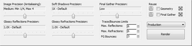 Дополнительная панель Reveal предоставляет доступ к глобальным настройкам управления сглаживанием, качества расчета отражений/преломлений в материалах и мягких теней, точностью работы алгоритма Final Gather (Рисунок 2).