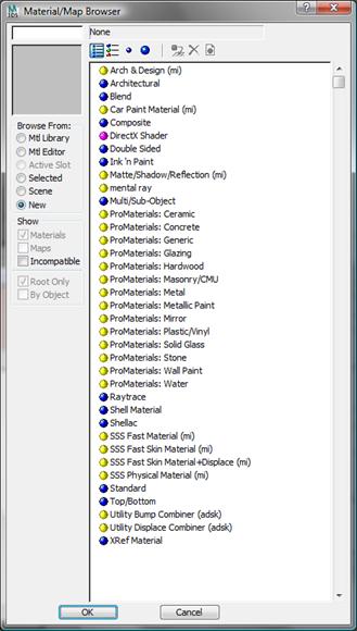 Шейдеры могут быть применены к различным типам объектов сцены, таким как геометрические модели, источники освещения, съёмочные камеры. В зависимости от того, к чему Вы хотите применить шейдер, будет зависеть список возможных (доступных) шейдеров в окне Material/Map Browser.