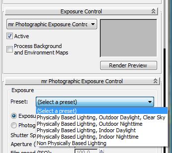 Рекомендуется в работе с плагином Exposure Control использовать режим «mr Photographic Exposure Control». Этот режим точно воспроизводит настройки реальных съёмочных камер, но требует, чтобы сцена была корректно смоделирована (Рисунок 17).