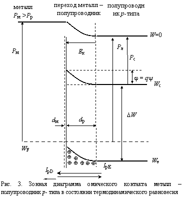 Зонная диаграмма контакта металл – полупроводник р-типа в состоянии термодинамического равновесия приведена на рис.3. Для этой пары должно соблюдаться условие Рм >Рр, тогда при установлении термодинамического равновесия Eк направлено из полупроводника в металл, вблизи металлургической границы возникает обогащенная дырками область, а неосновные носители – электроны находятся в потенциальной яме глубиной j = qy и не могут инжектироваться в металл.