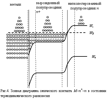 Изготовление омических контактов связано с большими трудностями. Концентрация дефектов и примесей на поверхности полупроводников существенно выше, чем в глубине монокристалла. На поверхности образуются обедненные основными носителями области и слои с инверсным типом проводимости, что существенно ухудшает свойства омических контактов. Для устранения этих недостатков создаются омические М–n+–n или М–р+–р контакты. Зонная диаграмма контакта М–n+–n в состоянии термодинамического равновесия приведена на рис.4. В связи с тем что металл контактирует с вырожденным полупроводником n+-типа, поверхностные дефекты не оказывают существенного влияния на качество контакта, а граница раздела вырожденный полупроводник n+ – низколегированный полупроводник n-типа находится в глубине монокристалла, где концентрация примесей и дефектов меньше, чем на поверхности. Аналогично изготавливают контакт М–р+–р.