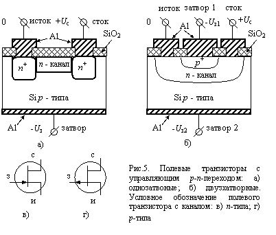Полевой транзистор (ПТ) с управляющим р–n-переходом имеет низколегированный проводящий канал с двумя омическими переходами (контактами). С одного из них – истока в канал – инжектируются основные носители (монополярная инжекция), с другого – стока носители заряда – выходят во внешнюю электрическую цепь. Для протекания тока по каналу между истоком и стоком необходимо за счет внешнего источника питания создать разность потенциалов Uис. Канал имеет длину а в направлении протекания тока и соответственно ширину b в направлении, перпендикулярном току. Перпендикулярно направлению тока изготавливается один или два управляющих р–n-перехода (затвора). Затвор всегда высоколегирован и имеет проводимость противоположного типа по сравнению с типом проводимости канала. Каждый затвор имеет омический переход (контакт). Потенциал затвора относительно истока может быть нулевым (затвор соединен с истоком) или обратно смещающим управляющий р–n-переход (для этого между затвором и истоком включается источник питания Uз). Полевые транзисторы могут отличаться типом проводимости канала. Изготавливаются транзисторы с каналом n-или р–типа. На рис.5 приведены структуры ПТ с одним (рис.5,а) и двумя затворами (рис.5,б) и условные обозначения ПТ с управляющим p–n-переходом и каналом n-типа (рис.5,в) и p-типа (рис.5,г).