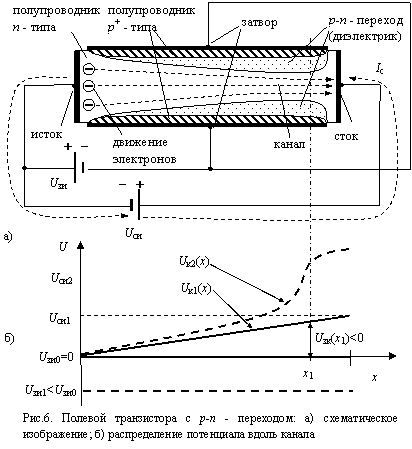 Увеличивая напряжение на стоке до Uc нас, можно перекрыть канал вблизи стока. При этом сопротивление канала rк(х) будет изменяться вдоль х, достигая максимального значения в сечении х1. Распределение потенциала Uк2(х) будет изменяться нелинейно (штриховая наклонная линия на рис.6). Максимальная напряженность продольного (вдоль оси х канала) электрического поля будет сосредоточена в самой узкой части канала. За счет электрического дрейфа электроны преодолеют перекрытую часть канала и достигнут стока. При дальнейшем увеличении напряжения на стоке перекрытая часть канала распространяется в сторону истока. Сопротивление канала rк увеличивается почти пропорционально увеличению Ucи, и ток Iс изменяется слабо.