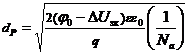 ; здесь φ0 – контактная разность потенциалов, Uзк(х) – напряжение на управляющем р-n - переходе в сечении х, ε – относительная диэлектрическая проницаемость, ε0 – диэлектрическая постоянная, q – элементарный заряд, а Nd – концентрация донорных примесей в канале n - типа. Концентрация акцепторных примесей Na в высоколегированном затворе р+-типа много больше концентрации донорных примесей, поэтому р–n-переход в основном располагается со стороны канала. Малая толщина обедненной области в затворе