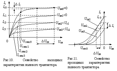Зависимость Iс=f(Uзи) при фиксированном напряжении сток–исток Uси называется проходной характеристикой транзистора. Одна из таких зависимостей приведена на рис.8,в. На ней можно выделить линейный участок и два нелинейных участка. Первый нелинейный участок (область отсечки) наблюдается при напряжениях на затворе, близких к напряжению отсечки Uси ≈ Uотс. Канал ПТ закрыт, и ток стока мал. Второй нелинейный участок возникает при подаче открывающего напряжения на затвор транзистора. При этом по каналу течет большой ток Iс0. В этом режиме вольт-амперные характеристики ПТ обычно не снимаются, на рисунке область насыщения нанесена точками.