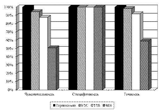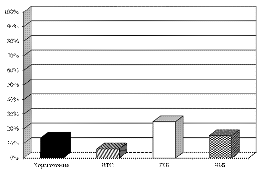 Рис. 1. Информативность торакотомии, ВТС, ТТБ и ЧББ в диагностике злокачественных периферических опухолей легких.