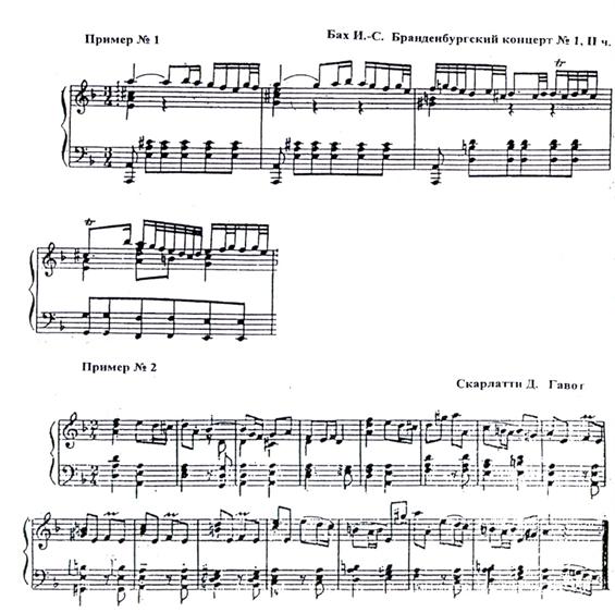Итак, в текстах клавирных сочинений барокко внутри многочисленных, часто встречающихся образцов двухголосия чаще других встречаются две мигрирующие из текста в текст редуцированные формы: 1) дуэт и 2) вертикальный диалог.