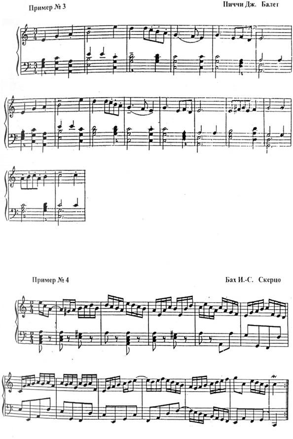 Рассмотрим с этой точки зрения ряд примеров. В “Гавоте” Д. Скарлатти, “Скерцо” и клавирной танцевальной пьесе под названием “Балет” Дж. Пиччи мы встречаемся с образцами двухголосной фактуры. Фактура выявляет, прежде всего, смысловую структуру музыкального диалога (continuo-solo). В сочинениях Д. Скарлатти и Дж. Пиччи она выдержана конструктивно до конца раздела (примеры № 2 и № 3). в “Скерцо” предпочитает выписать “партию continuo” дважды по-разному: сначала в виде аккордовой схемы (т. 1- т. 4) – (“ансамбль”), затем в виде одноголосного изложения (с т. 5 до конца) – (“continuo”), которое воспроизводится через “тембр виолончели” (пример № 4). Различное темброво-акустическое и динамическое решение в воспроизведении “образа оркестра” говорит о том, что два смысловых сегмента внутри одной смысловой структуры (continuo) отнюдь не тождественны, а ждут от исполнителя грамотной динамической и темброво-акустической расшифровки, переключения внимания, мастерства имитации оркестровых звучностей [3].