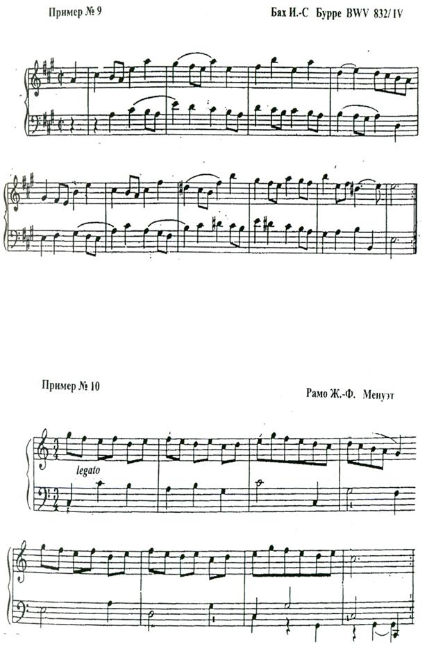 Подобные расшифровки часто встречаются и в редакторских версиях сочинений самых разных авторов. В Менуэте Рамо (пример № 10) мы видим типичный случай отождествления редактором орнаментальной структуры с мелодией. Предлагаемый обычно к исполнению в этой пьесе знак legato свидетельствует о желании редактора услышать в верхнем голосе именно кантилену. Благодаря аналогичной трактовке нижнего голоса (где также предлагается к исполнению legato) и вопреки содержанию заложенной там интонационной лексики (ритм шага, фигура дактилического шага, этикетная формула баса в кадансе), менуэт превращается в арию[11]. Что касается расшифровки верхнего голоса с точки зрения орнамента, то как и любой внемузыкальный элемент подобного типа, он состоит из отдельных тонко сплетенных узоров, которые, в отличие от орнамента как целостной структуры, скрыты внутри нее и могут быть выявлены лишь специальными артикуляционными приемами (акцент, мелкие лиги), причем, вариантно и каждый раз по-разному.