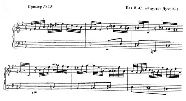 Орнамент партии “солиста” может быть организован в тексте как отдельный лирический смысловой пласт произведения, контрастно противопоставленный семантике партии continuo. Подобная позиция характерна для многих клавирных сочинений . К примеру, она встречается в двухголосных инвенциях № 3 и № 4 D-dur и d-moll, в Фантазии из 3-й партиты a-moll BWV 827, в Прелюдии № 3 d-moll из цикла “Маленькие прелюдии и фуги”, в 1-й пьесе из цикла “4 дуэта” (пример № 13). Во всех перечисленных примерах обнаруживается одна и та же устойчивая смысловая конструкция, в которой наблюдается фактурно-графический контраст “восьмых и шестнадцатых”. Сами по себе “восьмые и шестнадцатые” относятся к структурам грамматического порядка и являются лишь внешними признаками смысловой оппозиции. Однако за ними скрывается глубинный слой интонационно-лексического ряда. Так, во всех примерах партии continuo наблюдается “ритм шага-шествия”[12]. Его скорбно-трагические значения могут быть усилены исполнительским штрихом portamento, также как и актуализация ряда значений, “скрытых” в графике нотного текста. К примеру, “фигура чаконы” в “звуковом абрисе” сильных долей басового хода Партиты a-moll может быть выявлена дополнительным приемом акцентуации и вытянута в отдельную звуковую “линию”.