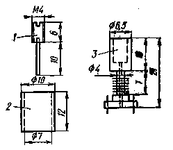 Для катушек индуктивности использованы готовые каркасы с подстроечниками и экранами от контуров ПЧ малогабаритных транзисторных радиоприемников (в частности, от радиоприемника «Альпинист»). Эскиз такого каркаса приведен на рис. 2. После намотки катушки в секциях на каркас 3 надевают цилиндрический магнитопровод 2, а внутрь каркаса ввинчивают подстро-ечник 1. Затем эта конструкция заключается в алюминиевый экран размерами 12x12x20 мм.