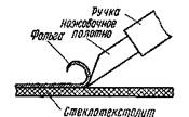 Печатный монтаж можно выполнить по любой технологии — вытравить, прорезать канавки ножом или резаком. В последнем варианте удобно пользоваться специально заточенным резаком из отрезка ножовочного полотна (рис. 6). Изолирующие канавки в фольге прорезают, часто покачивая инструмент из стороны в сторону и относительно медленно продвигая вперед. При некотором навыке плата «гравируется» таким способом довольно быстро.
