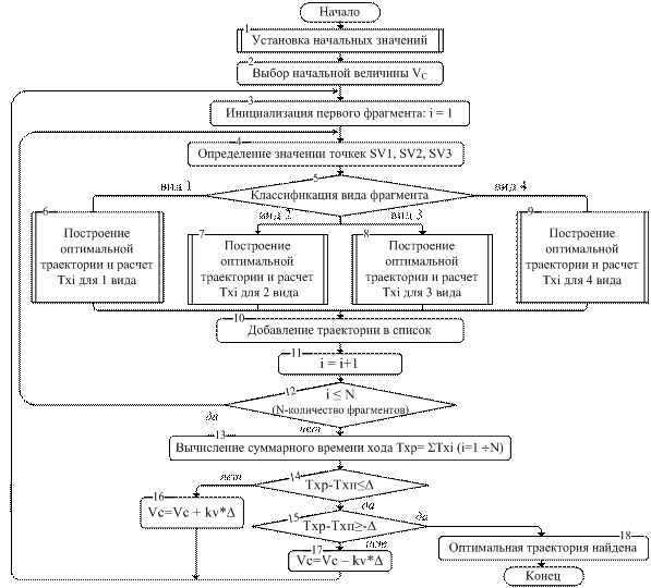 Укрупненная схема алгоритмы синтеза энергооптимальных траекторий представлена на рис. 3. Схема алгоритмов, определяющих работу блоков 6-9, приведены в тексте 3-ей главы. Для иллюстрации в автореферате представлена схема алгоритма при постоянном ограничении скорости, что соответствует блоку 7.