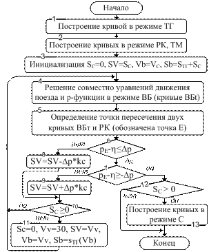 Следует отметить, что начальные условия р-функции для различных режимов зависят от предыдущего режима, ограничения скорости и профиля пути. На основе этого и начальных условий для режимов ВБ, РК или ТГ на оптимальной траектории решаем совместно систему дифференциальных уравнений движения поезда и р-функции в режимах ВБ, РК или ТГ (только при наличии крутого подъема). Если