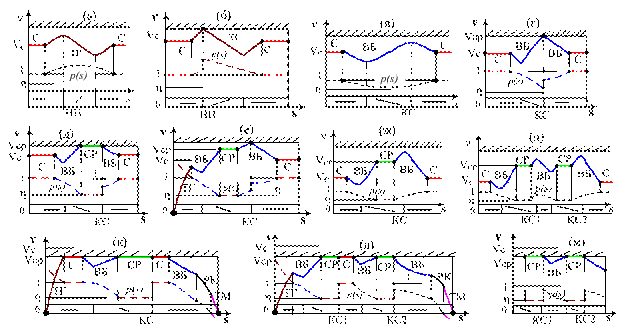 - при последовательности режимов РК/СР-ВБ-С р-функция в режиме ВБ увеличивается от значения р=h до р=1 в конце режима ВБ (рис. 6.д-и). При достижении поездом допустимой скорости в режиме ВБ р-функция терпит разрыв в точке КС и траектория ВБ разделяется на два участка: один участок находится левее точки КС, другой участок правее точки КС (рис. 6.д-е);