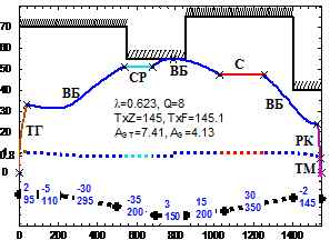 При наличии крутых спусков на перегоне режимы ВБ, СР на оптимальной траектории могут возникать внутри перегона. Если на перегоне существуют крутые подъемы, то на оптимальной траектории дополнительно может возникать режим ТГ внутри перегона. В процессе поиска точек переключения режимов следует отметить: