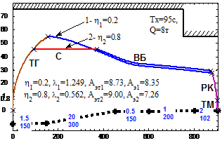 Первый случай изменения структуры траектории возникает, когда в найденной траектории при заданном η=η1 отсутствует режим стабилизации и происходит переход из режима тяги в режим выбега, а новое значение VС при η=η2 оказывается ниже скорости перехода из тяги в выбег (VТВ), т. е.