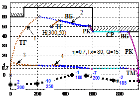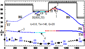 Рассмотрим далее анализ влияния массы поезда и коэффициента h на энергооптимальную траекторию. Величина коэффициента η непосредственно связана с расходом энергии на тягу поездов. Вместе с тем, открытым остается вопрос как изменяется вид оптимальной траектории, на сколько смещаются координаты переключения режимов в том случае, когда их последовательность при различных значениях η остается неизменной, на каких перегонах изменяется последовательность режимов, на сколько и на каких перегонах изменяется расход энергии, потребляемый поездом в тяговом режиме на оптимальной траектории. Очевидно, что ответы на эти вопросы зависят от заданного времени хода поезда по перегону и его массы. Следующие количественные и качественные показатели будут характеризовать влияние η и массы загрузки Q поезда на вид оптимальной траектории: