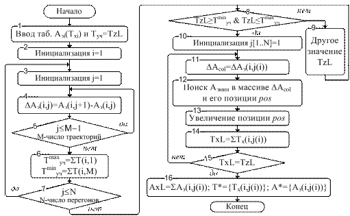 Рис. 15. Блок-схема алгоритма распределения времени хода по 1-ой линии Ханойского метрополитена на времена хода по перегонам.