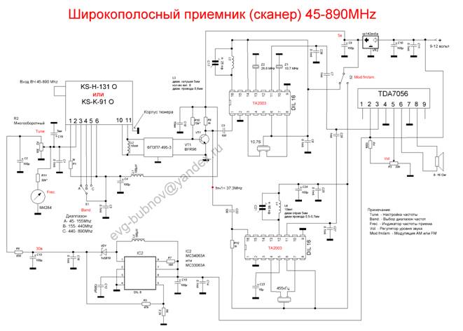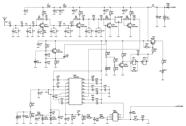 В одном варианте схемы « каша » из частот проходит ФНЧ и усиливается двухкаскадным предварительным УПЧ прежде чем попасть на вход TDA 7000 . В другом варианте вообще какие либо фильтры отсутствуют и вся смесь частот приходит после однокаскадного предварительного усилителя на вход TDA 7000 .