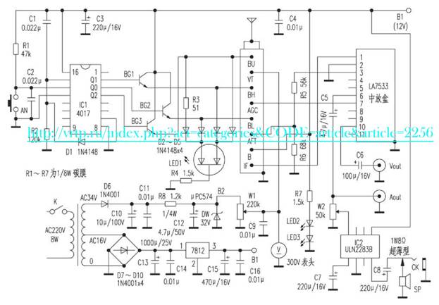 Аудио усилитель IC2 блок модели ULN2283B, если не просто купить в состав могут быть использованы на LM386 аудио усилитель цепи. Тюнер 220KΩ потенциометр W1 выбранным цветом области перестройки частоты потенциометром, тюнер 30V DC микро-инструкции с помощью первой таблице.