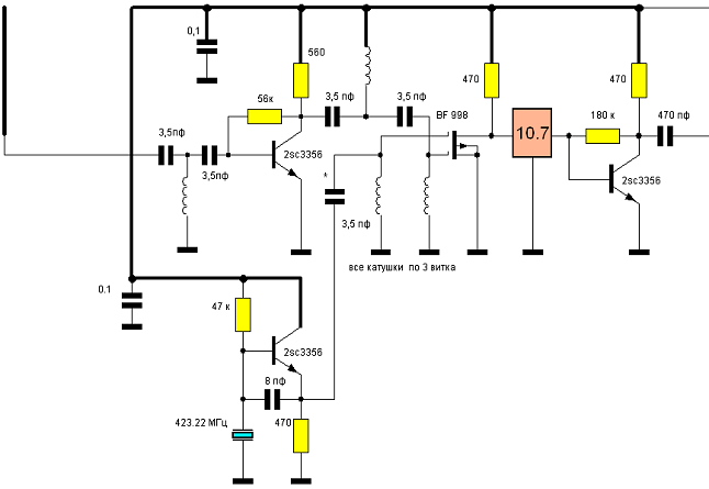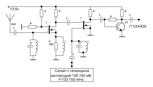 Приблизительно так и будет выглядеть, только контур в истоке первого транзистора не нужен ( думаю это опечатка ) там емкость должна быть. Меняя ПЧ вы будете настраиваться на нужную вам частоту. ПЧ - это разница по модулю между частотой входного сигнала и частотой гетеродина ( или его гармоникой ). Под ПЧ я имел ввиду частоту настройки гетеродина ХА 42 ( она может быть до 150 мГц ) , здесь я не учитываю собственную низкую ПЧ микросхемы.