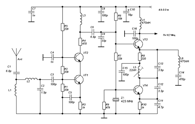 Первая ПЧ выбирается равной разности между частотой принимаемого сигнала и частотой первого гетеродина, он собран на ПАВ резонаторе 418 МГЦ.