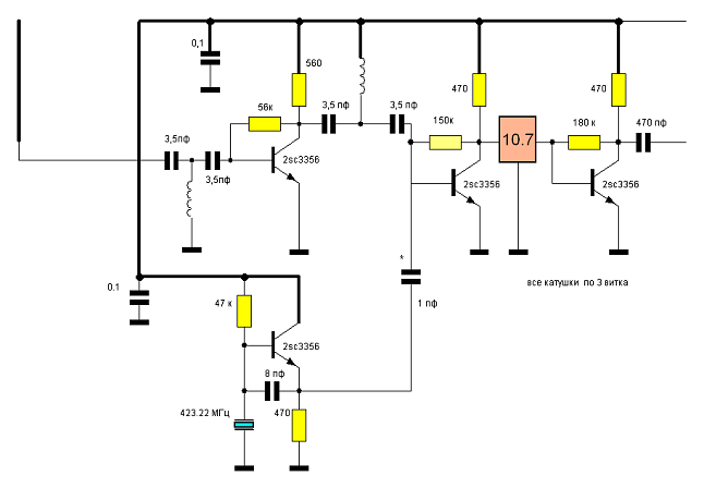 ВЧ часть, разработанную моим земляком, господином ШАТУНОМ, я вообще считаю лучшей в мире. Дальше идет пьезик на 10,7 МГц (его в принципе лучше заменить одиночным контуром, так как разница между частотами ПАВ-ов может превышать его полосу пропускания ). Контур нужен и в том случае, если не удается прикупить резонаторы со стандартной разницей в ПЧ, на которую существуют промышленные фильтры. Транзистор смесителя нагружают на первичную его обмотку, а ко вторичной подключают через развязывающую емкость усилительный каскад на транзисторе, либо от отвода этой катушки ( кому как нравится ).В качестве УПЧ+ЧД применен стандартный приемник с низкой ПЧ, который можно подстраивать в небольших пределах.
