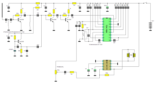 В качестве собственно УПЧ детектора и предварительного УНЧ работает TDA 7000 в стандартном включении.
