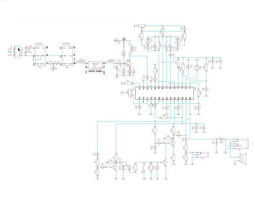 Благодаря встроенной АПЧГ, устройству сжатия девиации частоты, TDA 7000 довольно хорошо справляется со своими обязанностями и на ее выходе получается достаточно качественный и разборчивый сигнал. Фильтром по низким частотам является цепочка из резистора 22 к и параллельно ей емкости 5600 пф.
