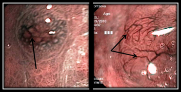 Архитектоника сосудистого рисунка | Нерегулярная, рисунок стерт с формированием прерывистых петель разного калибра | Регулярная, не нарушена | Регулярная, соответствует изменениям ямочного рисунка | Не изменена | Нерегулярная, рисунок стерт с формированием прерывистых петель. Альтерация калибра сосудов | Дилатация субэпителиальных сосудов, с формированием угловатого сосудистого рисунка |