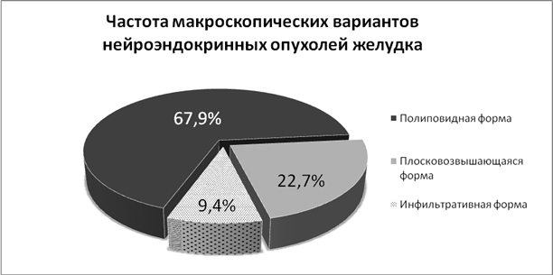 На основании разработанных критериев все клинические наблюдения НЭО желудка, включенные в настоящее исследование, были разделены на 3 группы в зависимости от макроскопической картины: 1) плосковозвышающаяся форма; 2) полиповидная форма; 3) инфильтративная форма.