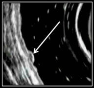 Визуализируется в виде гипоэхогеного образования с гетероэхогенными включениями, характеризуется инфильтративным ростом со значительным распространением опухолевой инфильтрации по подслизистому слою (рис. 6).