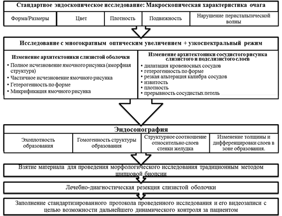 Ведущая роль в диагностике патологических изменений желудка принадлежит эндоскопическому методу исследования. Постоянное техническое совершенствование эндоскопической аппаратуры, появление Zoom - и NBI-методик позволяет проводить исследование с увеличением в 115 раз без потери качества изображения. Кроме того, осмотр в режиме спектральной визуализации сосудистой структуры ткани дает возможность в лучшей степени дифференцировать капилляры и иные структуры в высоком контрасте к окружающим тканям. В последнее время возможность одновременно сочетать эндоскопический осмотр с ультразвуковым методом исследования (появление радиальных и конвексных эхо-эндоскопов, тонких ультразвуковых датчиков) позволяет под визуальным контролем проводить прицельное ультразвуковое сканирование патологически измененной стенки органа и оценивать состояние регионарных лимфатических узлов [Chung A., Kwan V. 2009].