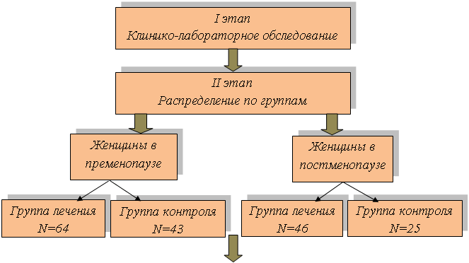 Всем женщинам после включения в исследование было проведено обследование с применением перечисленных ниже методов. После обследования пациенты были разделены на 4 группы (рис.1). Группа I: 64 женщины в пременопаузе (средний возраст 45,2+2,9 года), получившие рекомендации по приему КОК с дроспиреноном. Группа Ia: 46 женщин (средний возраст 44,1+1,9 года), не получавшие гормонотерапии. Группа II: 43 женщины в постменопаузе (средний возраст 50,6+5,6 года), которым была назначена ЗГТ низкдозированным монофазным препаратом с дроспиреноном. Группа IIа: 25 пациенток (средний возраст 52,6+3,01 года) лечения не получали. Длительность терапии в основных группах составила 12 месяцев.