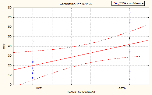 Наличие депрессивных расстройств в период пери - и постменопаузы можно объяснить как прямым эффектом состояния гипоэстрогении, вследствие недостаточного эстрогенного влияния на структуры ЦНС, так и выраженностью вазомоторных симптомов (Bromberger J. T, Meyer P. M, 2001); Балльная характеристика качества сна показала наличие исходной инсомнии (количество баллов менее 18) у пациенток всех групп. Средний балл (10,2+0,4), характеризующий гипервентиляционные нарушения оказался выше нормы в пременопаузе, и значительно выше (20+0,4) в постменопаузе (норма - 0 баллов). Наличие гипервентиляционного синдрома (ГВС) во всех группах было обусловлено состоянием гипоэстрогении, что подтверждает прямая корреляция между уровнем ФСГ и средним баллом ГВС (рис. 2).